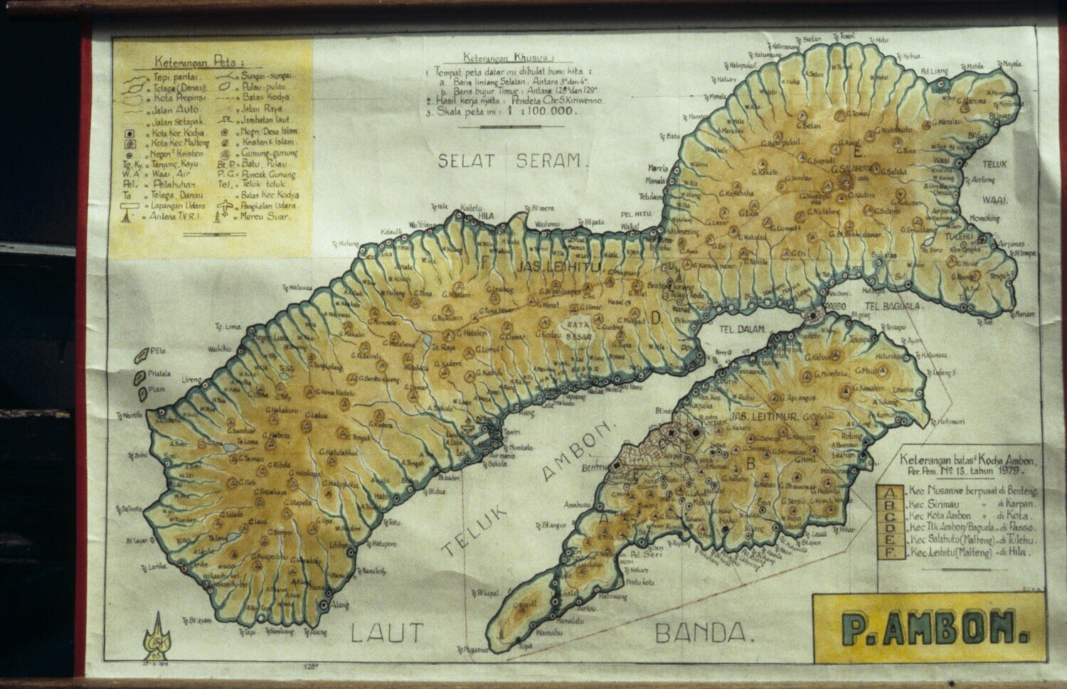 Handingekleurde kaart van Ambon uit 1979, Kota Ambon, Molukken.