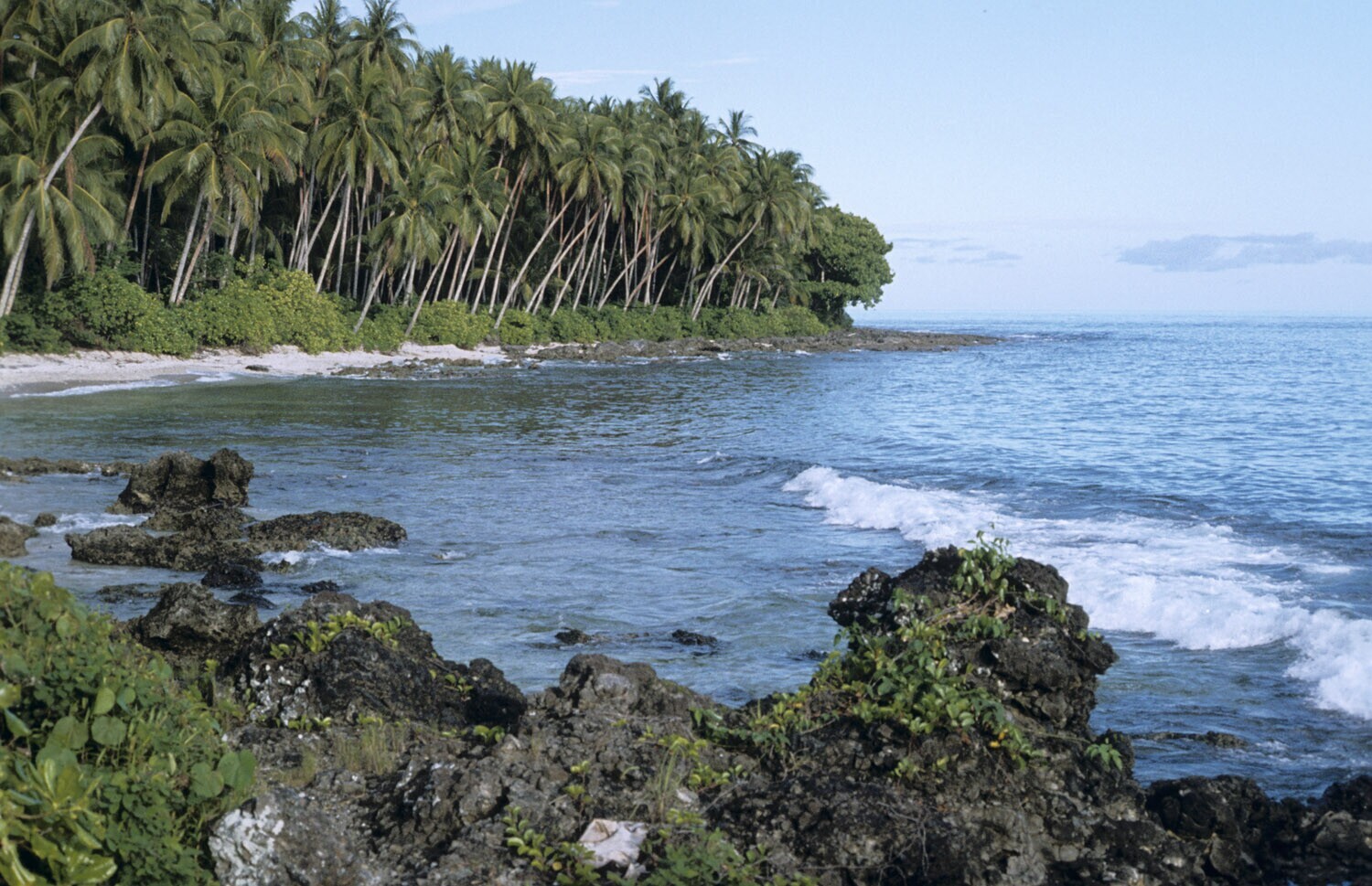 Het rotsstrand van Kota Ambon, Ambon, Molukken.