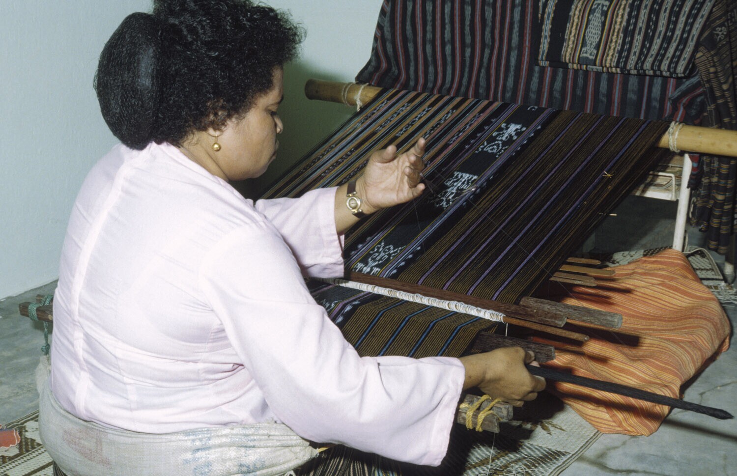 Een vrouw is bezig met het weven van een 'Tanimbar kleed'. Kota Ambon, Molukken.