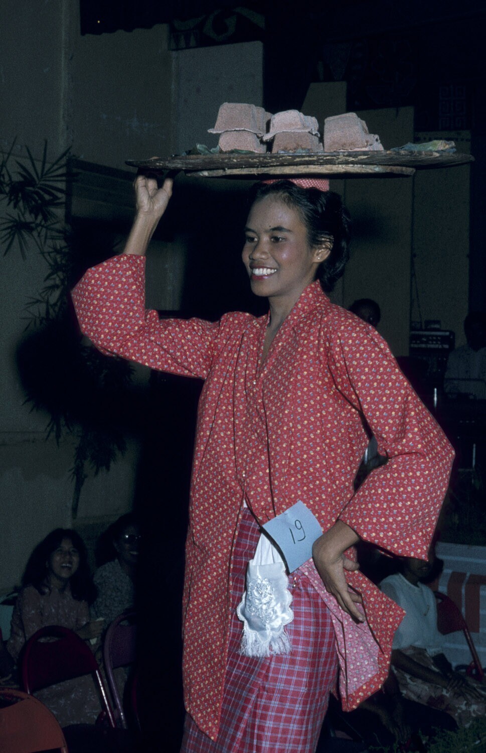 Een kledingdemonstratie van Molukse adatkleding, dagelijkse kleding uit Maluku tengah, op het hoofd een houten schaal waarop sago lempeng. Kota Ambon, Molukken.