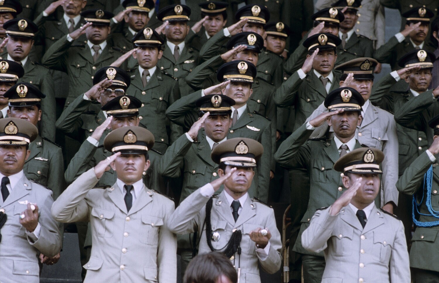 Saluerende officieren tijdens de 'Panca Sila' (nationale manifestatie op 1 oktober) in het stadion van Kota Ambon, Molukken.