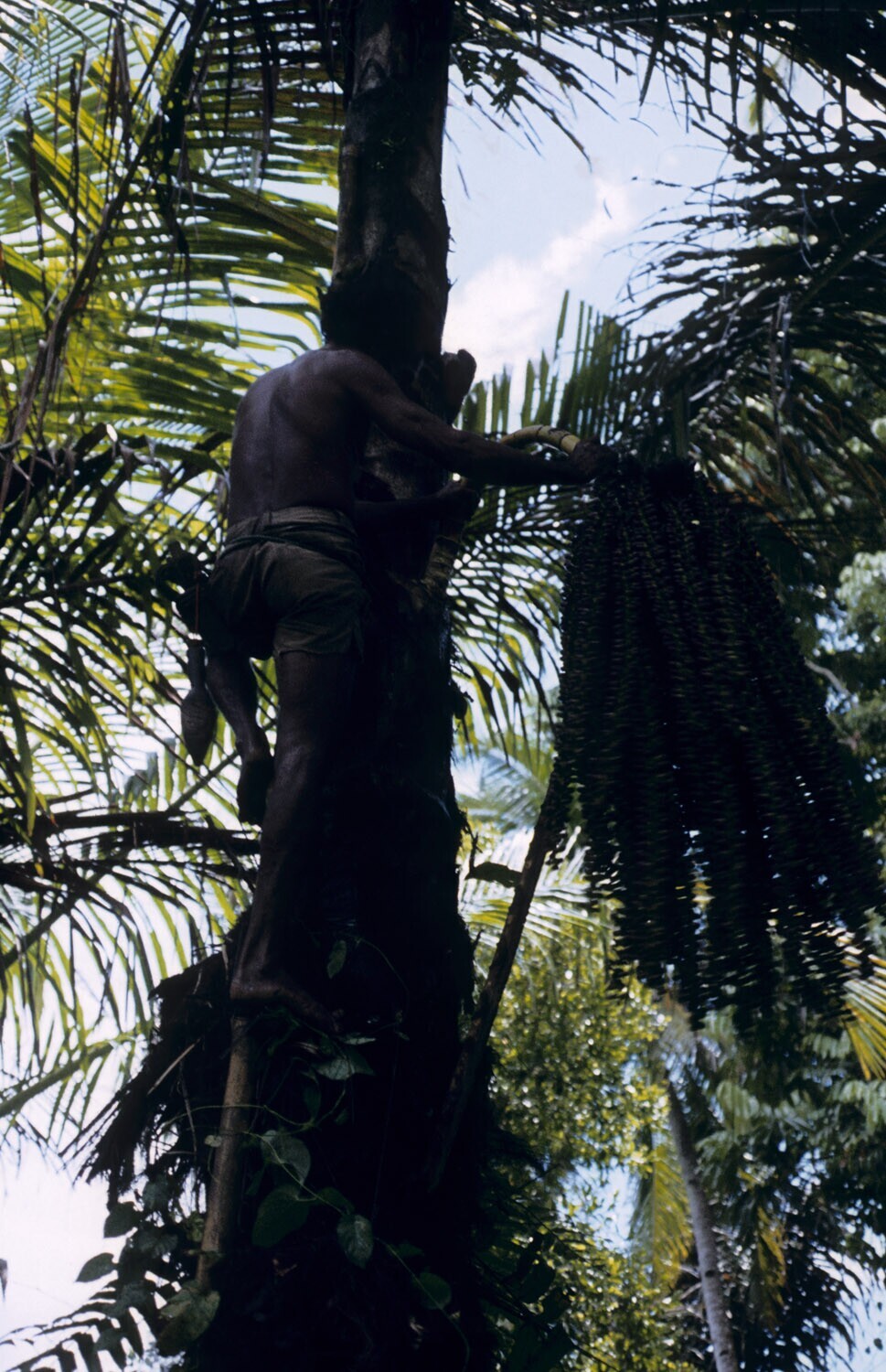 Het suikertappen van een arenpalm. Na het wegsnijden van de overtollige bladscheden en vuil wordt de bloemsteel beklopt met een houten hamer en heen en weer bewogen, dit voor een betere saptoevoer. Saparua, Molukken.