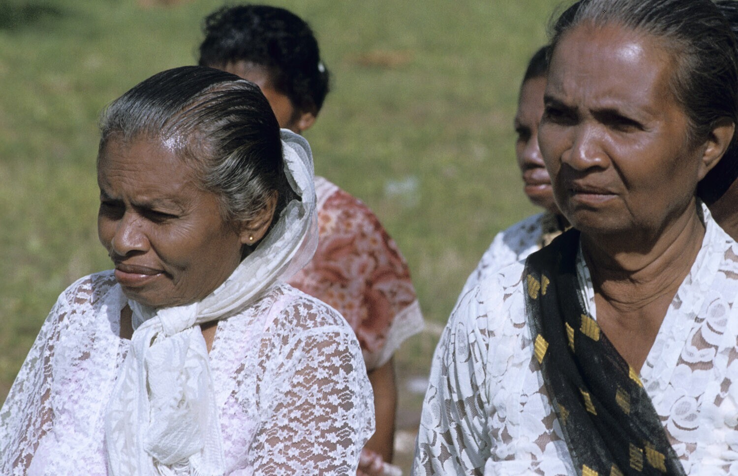 Dubbelportret van twee vrouwen die deel uitmaken van de commisie van ontvangst die gereed staat voor de begroeting van de deelnemende schepen aan de ''Belang Prauw'', een grote roeiwedstrijd in Tual