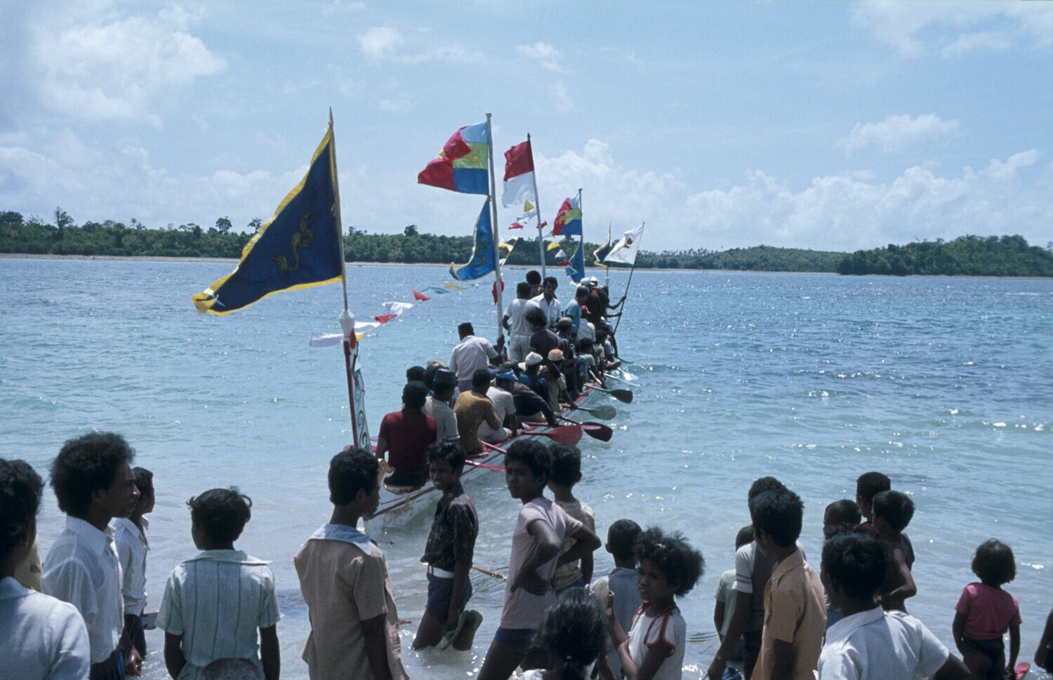 'Een prauw, die deel gaat nemen aan de ''Belang Prauw'', een grote roeiwedstrijd in Tual op Kei, Molukken. Het is voor het eerst in 20 jaar dat deze wedstrijden georganiseerd worden.'