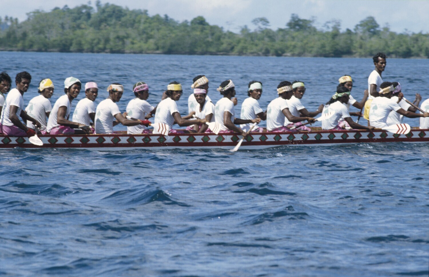 'De halve finale in de ''Belang Prauw'', een grote roeiwedstrijd in Tual op Kei, Molukken.'