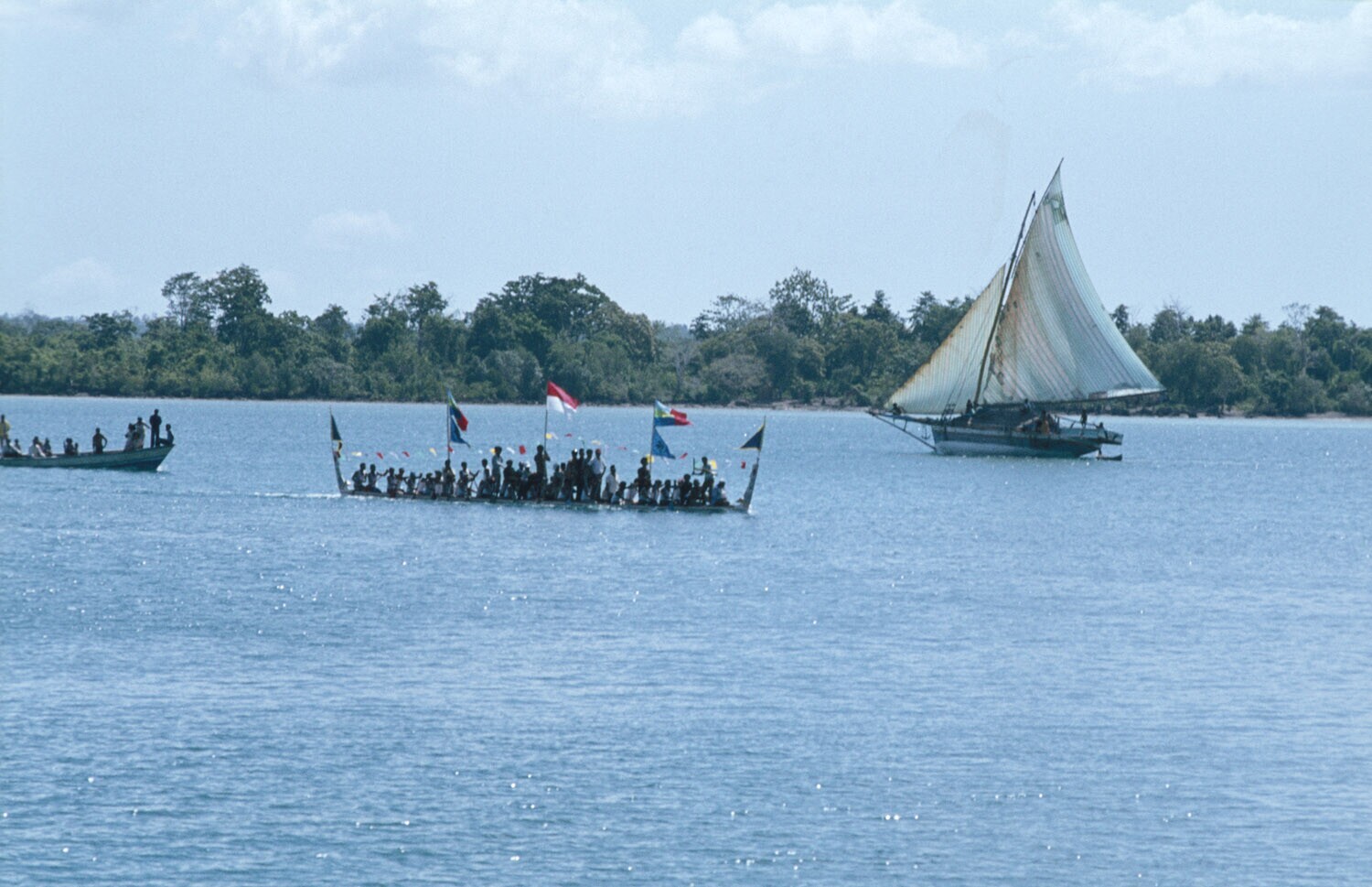 'Een wedstrijdprauw, die deel gaat nemen aan de ''Belang Prauw'', een grote roeiwedstrijd in Tual op Kei, Molukken. Op de achtergrond ook een zeilboot.'