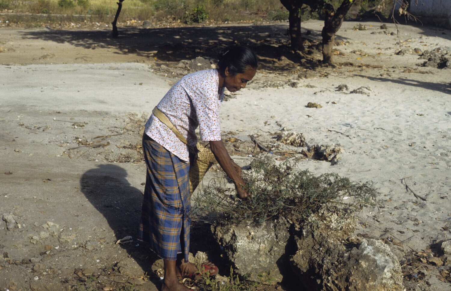Het plukken van indigoblad als plantaardig blauwe verfstof in de weverij. Kandar op Selaru, Molukken.
