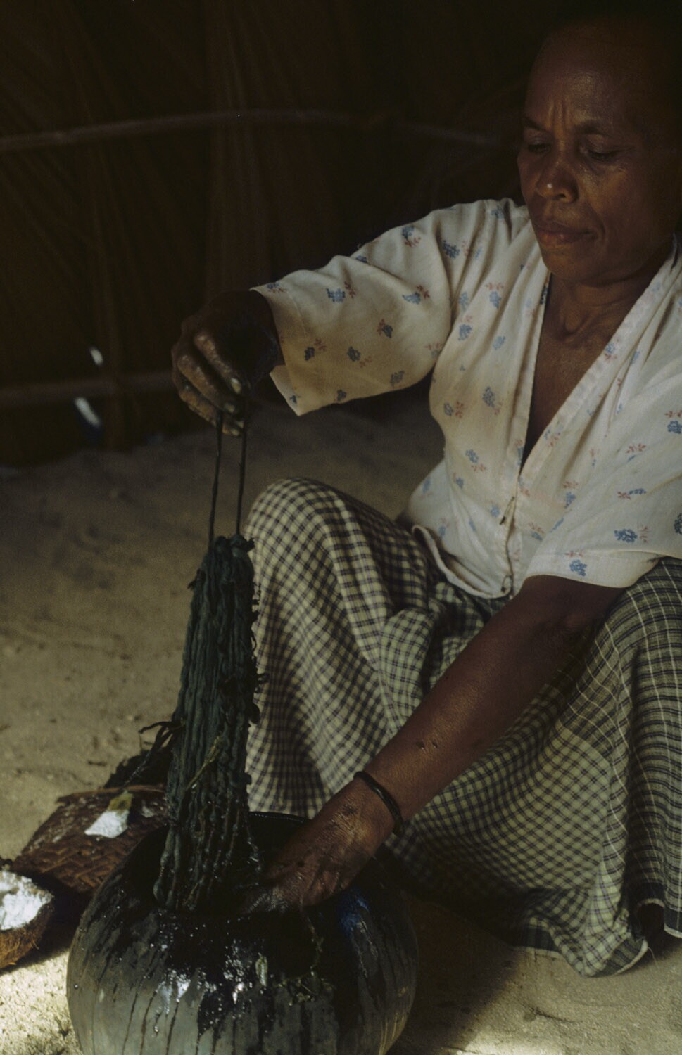 De geplukte indigobladeren worden met de hand fijngewreven en dan met wat water en kalk in een aardewerk pot gedaan. De geikatte draden worden in de pot gedaan en goed geroerd. Kandar op Selaru, Molukken.