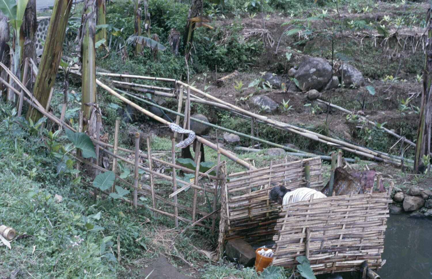 Bamboe waterleiding naar een afgeschermd plateau bij een visvijver wat dient als bad en wasplaats. Midden-Java.