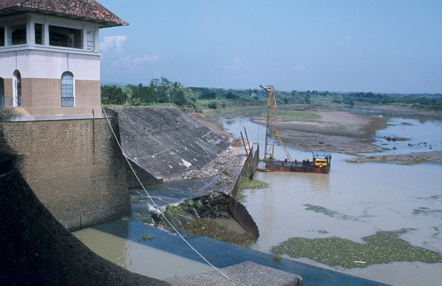Gedeelte van de Walahar-stuw met de Citarum benlen de dam, Java.