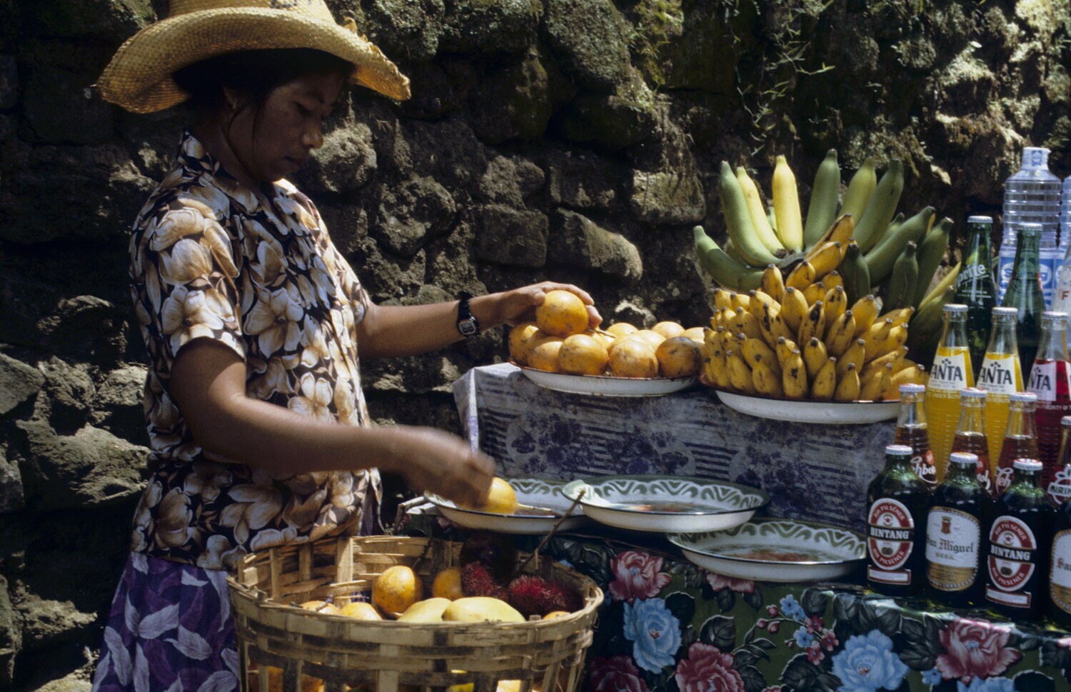 Verkoopster met drank en fruit bij de Pura Goa Gajah of Olifantsgrot