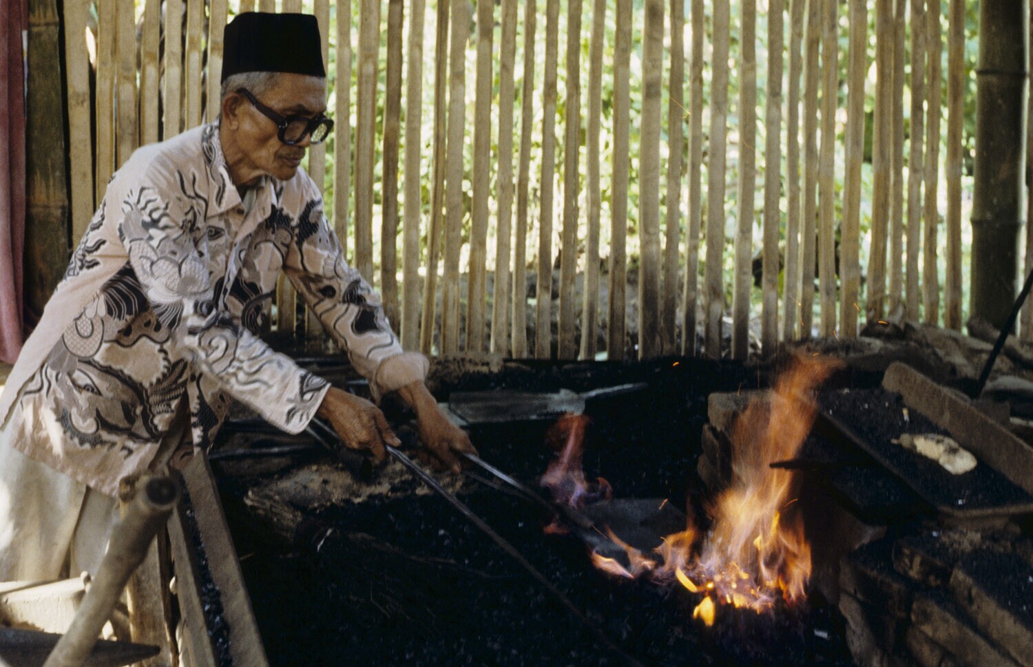 Smederij. Smid houdt een stuk ijzer in het vuur. Singaipuar, West-Sumatra.