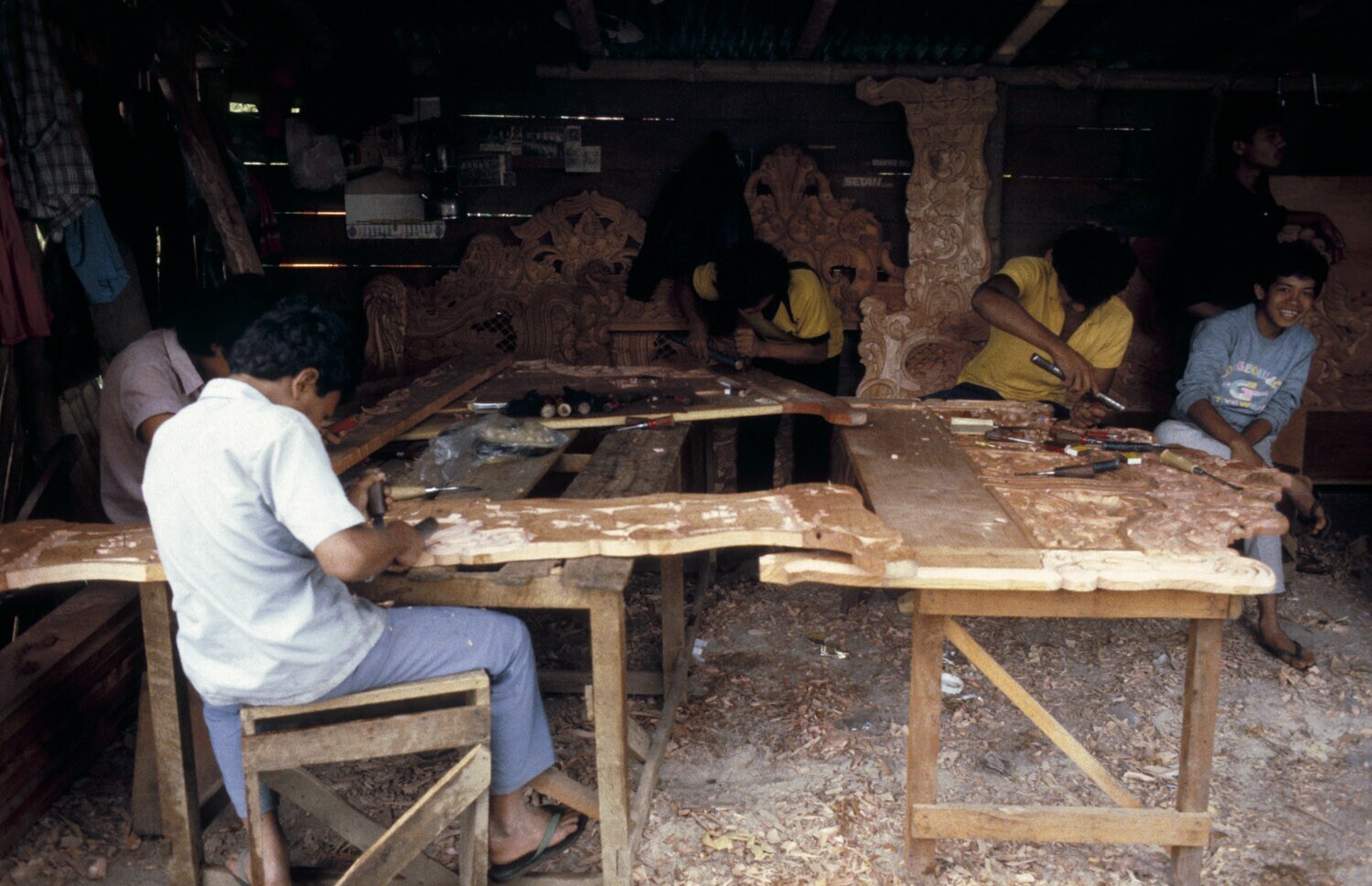 Houtsnijders aan het werk in hun atelier, omgeving Bukittinggi