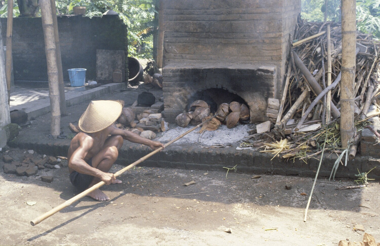 Het opstoken van de pottebakkersoven met klapperschillen. Pottenbakkersdorp Kasongan op Java.
