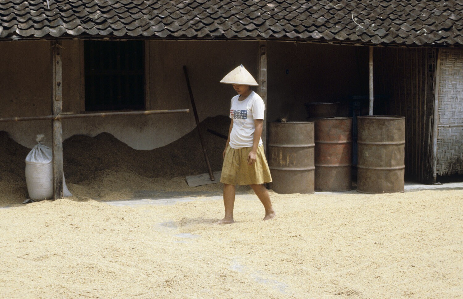 Vrouw dorst rijst met haar blote voeten. Kasongan op Java.