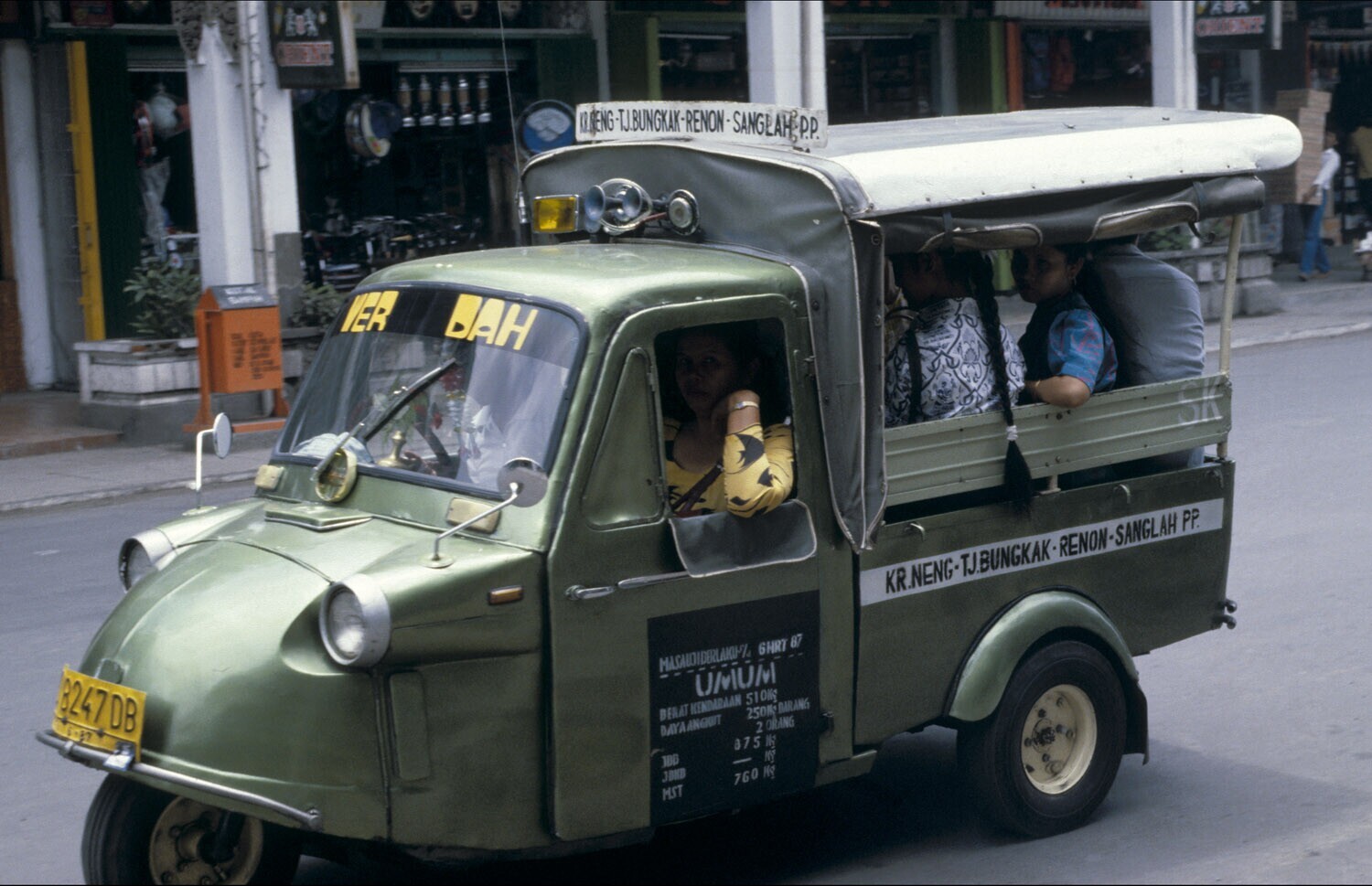 Personenvervoer in de hoofdstraat Jalan Gadjahmada in Denpasar op Bali.