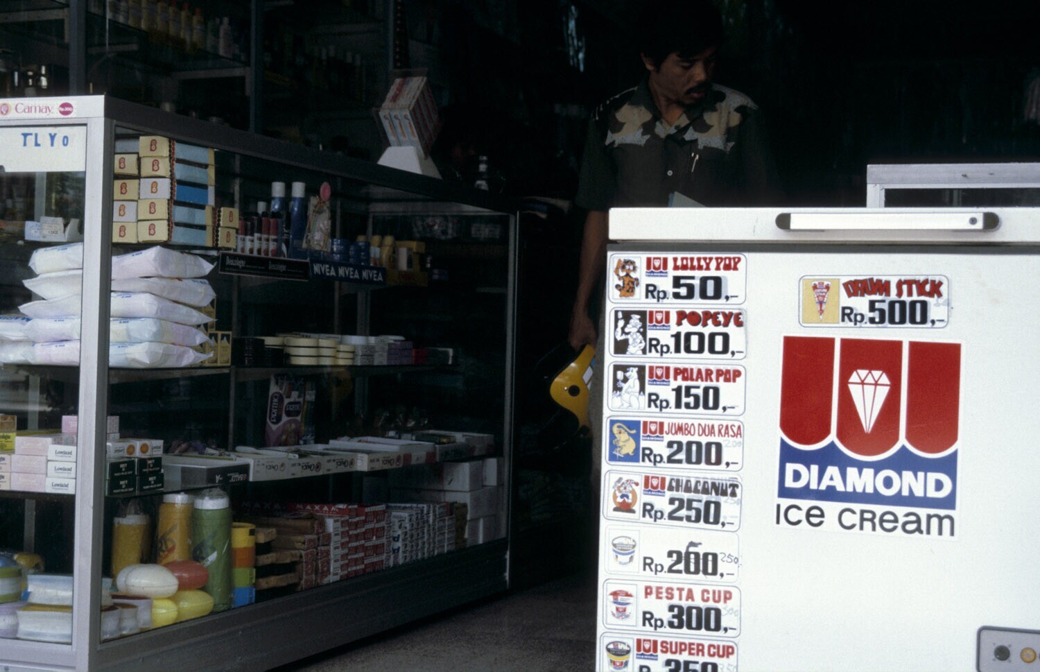 Winkeltje met een grote diepvrieskist met ijs bij de ingang. Denpasar, Bali.