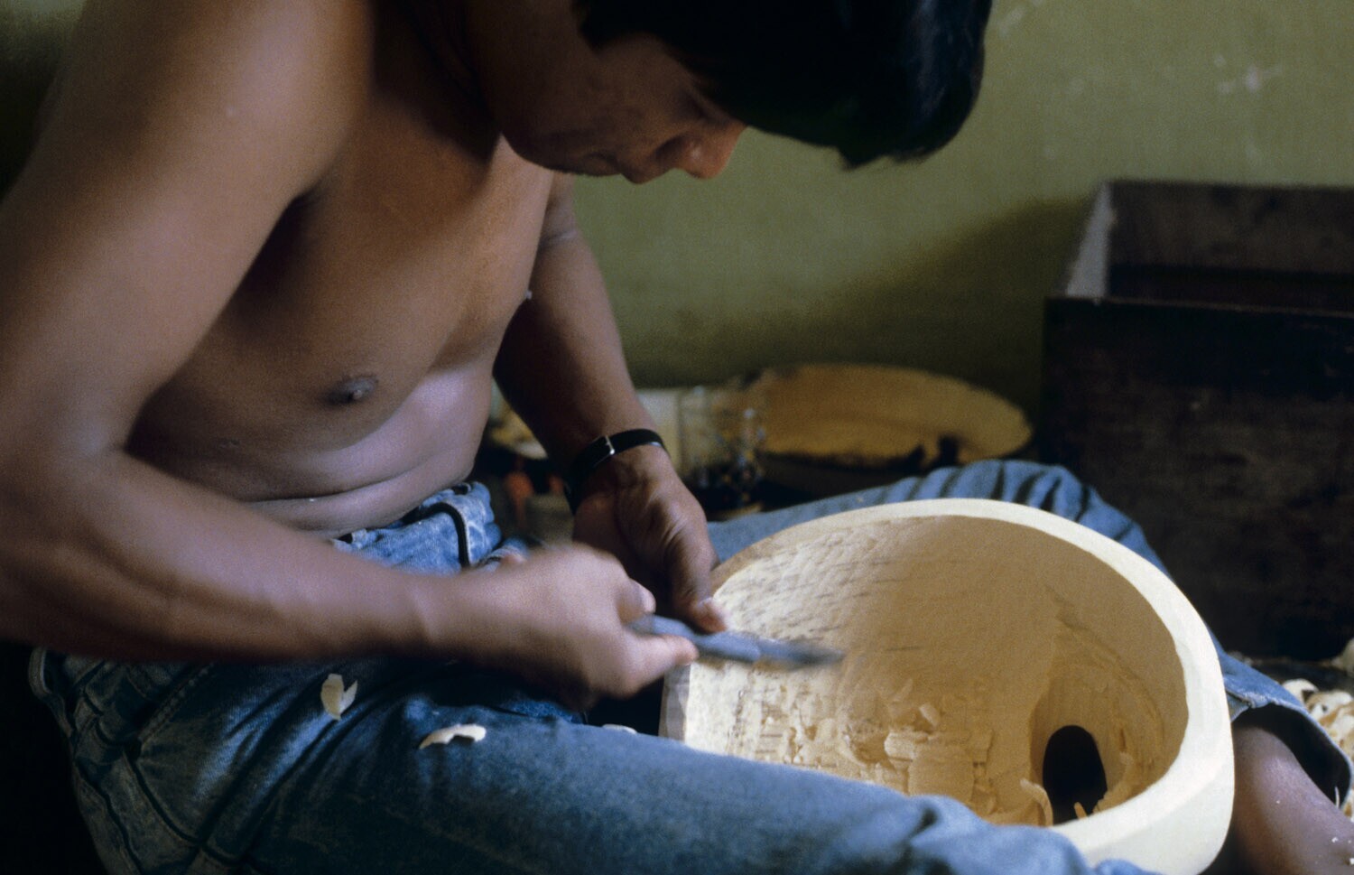 Het snijden van een masker in het atelier van Ida Bagus Anom