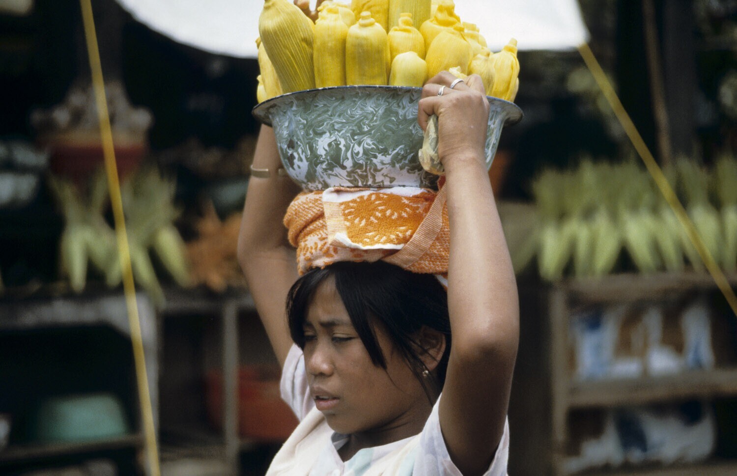 Verkoopster van gekookte maiskolven draagt haar koopwaar in een schaal op het hoofd. Bali.