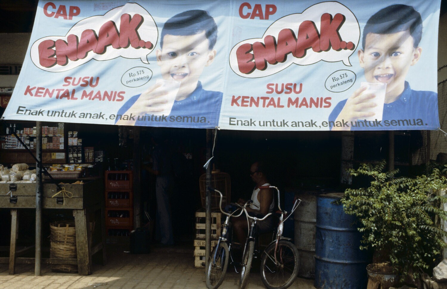 Winkeltje met reclame voor stroop susu. Tasikmalaya, Java.