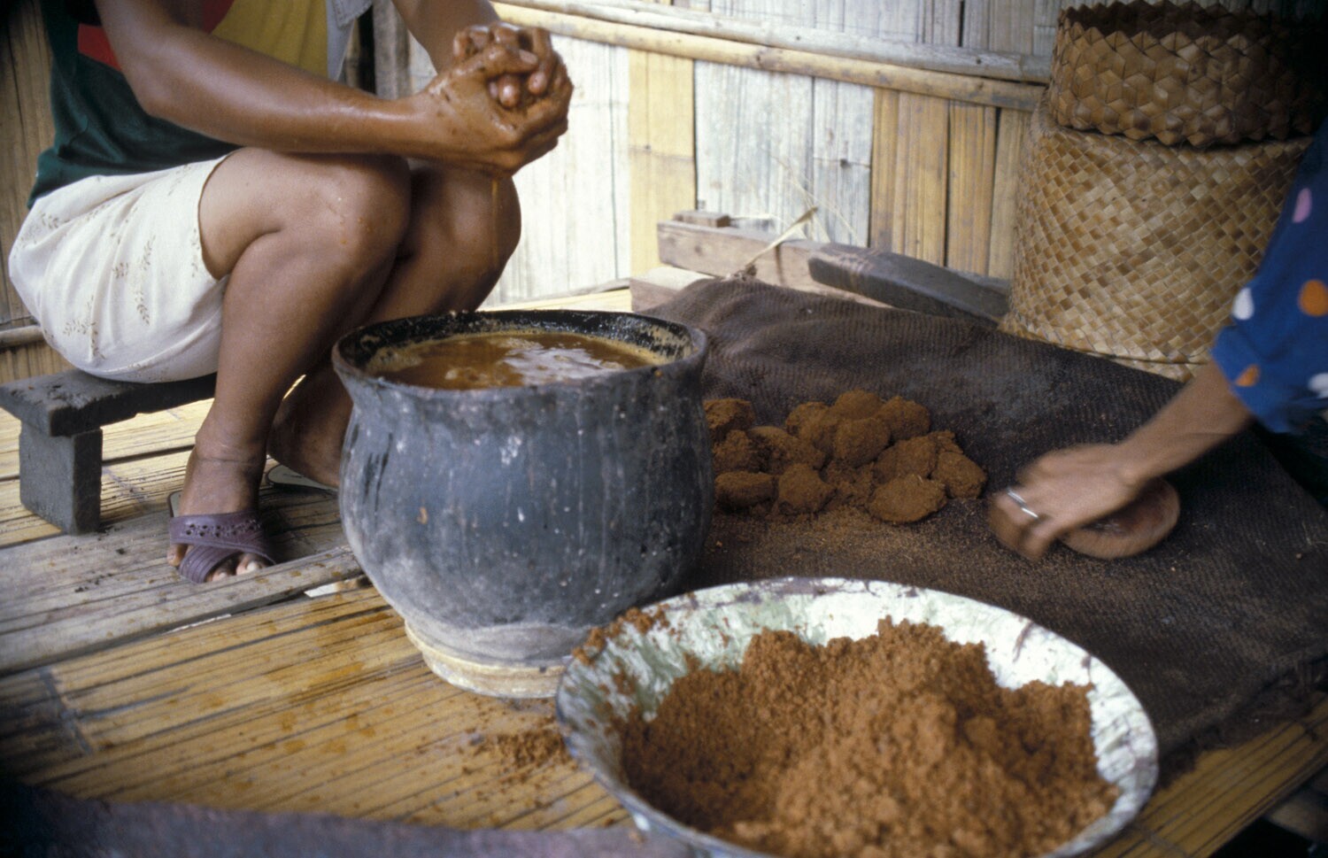 Verfkommen voor de omonwonden draden (ikat). Werkplaats van Iwan Tirta, een textielontwerper in Jakarta. Ende, Flores.