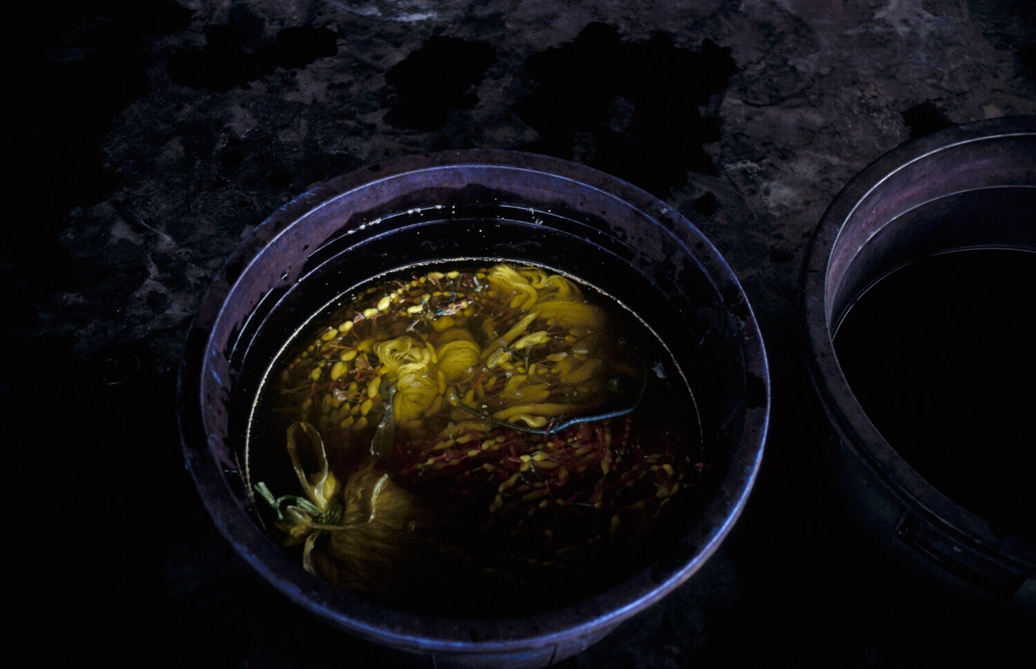 De omwonden draden worden in het verfbad (blauw) gedompeld. Werkplaats van Iwan Tirta, een textielontwerper in Jakarta. Ende, Flores.