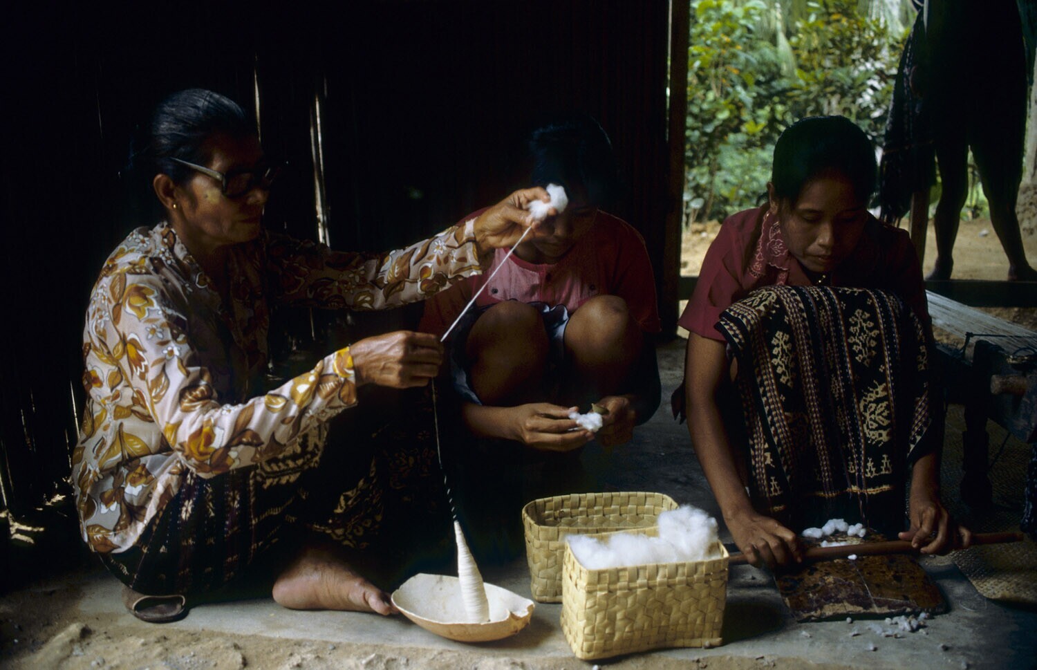 'Het spinnen van katoen; de spintol rust in een schelp. De rechter vrouw is bezig met het ontpitten van de katoenpluizen. Timor.'