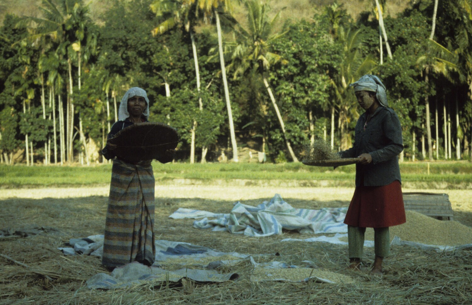 'Het wannen van rijst door twee vrouwen uit Sumbawa. Eén van de vrouwen heeft haar gezicht ingesmeerd met ''siemie'' (op Sumbawa ''tepi''). Hiermee wordt verbranding door de zon voorkomen, bovendien helpt het tegen puistjes. Desa Pamulung, Sumbawa.'