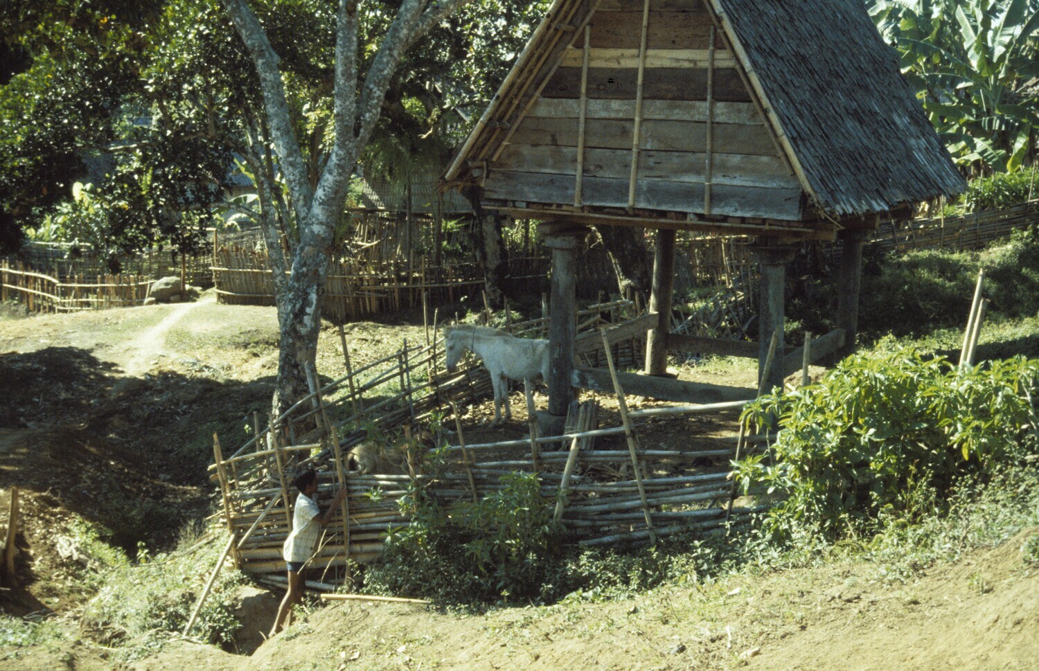 Ijstschuur gebouwd op palen; eromheen een omheining waarbinnen ook het paard gehouden wordt. Het paard wordt gebruikt voor transport, niet als rijdier. Tepal, Sumbawa.