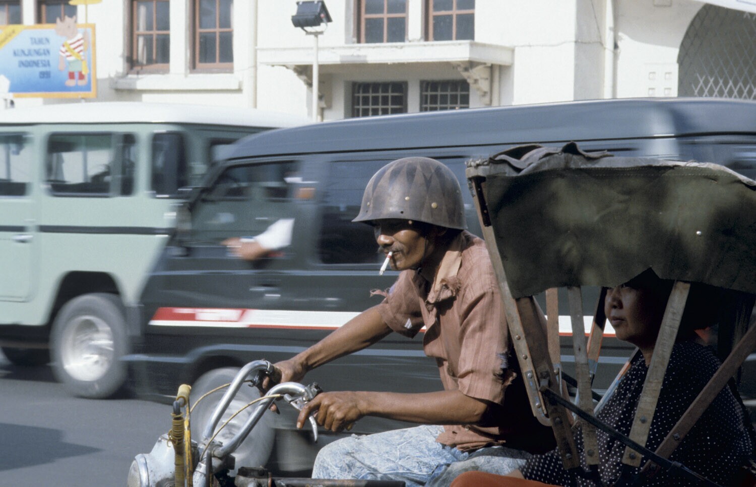 Sumatra, Medan. Close-up van (kretek rokende) becak-rijder.