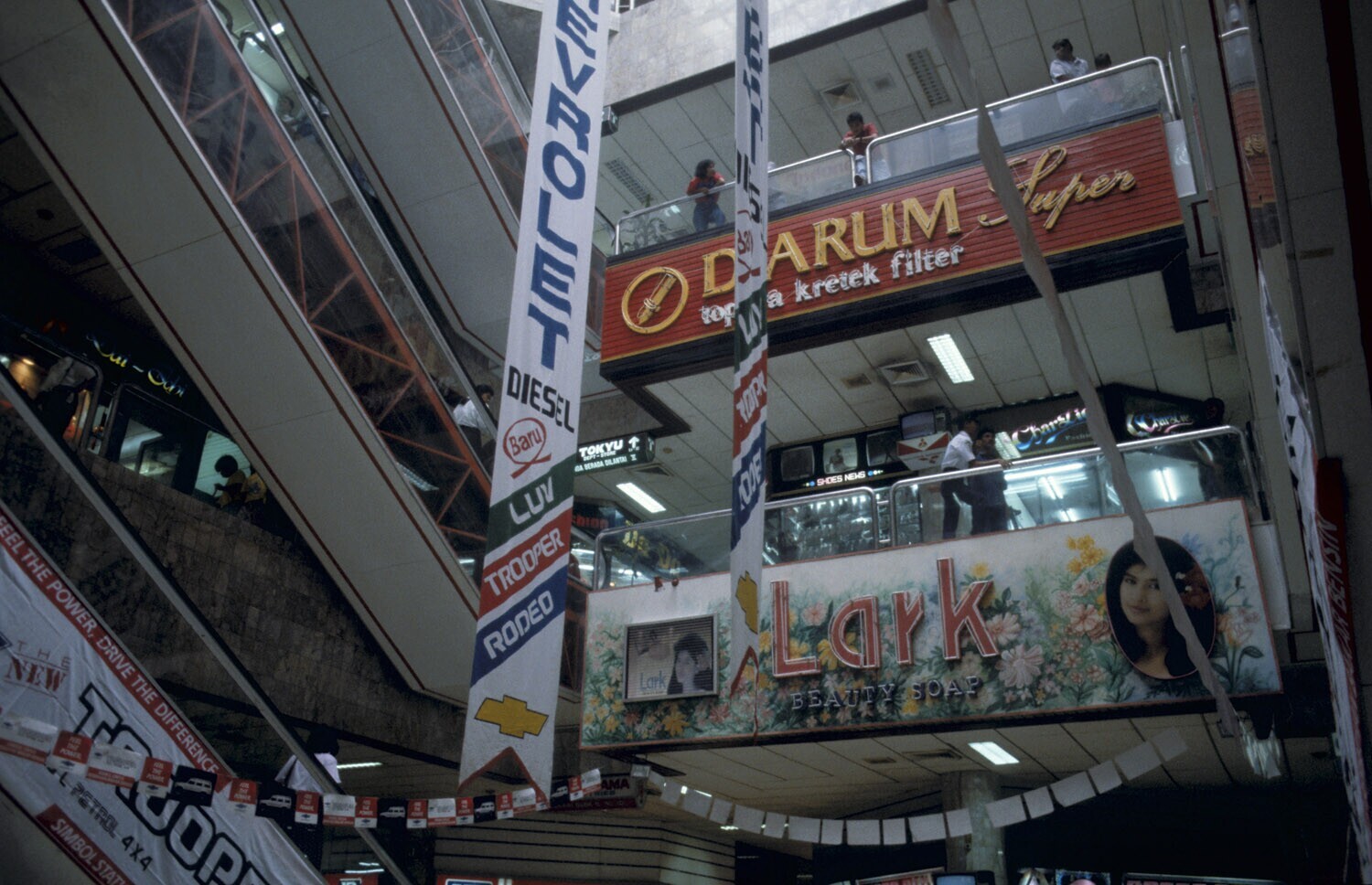Sumatra, Medan. Interieur van een groot warenhuis, met reclameborden, van o.a. Chevrolet en sigaretten.