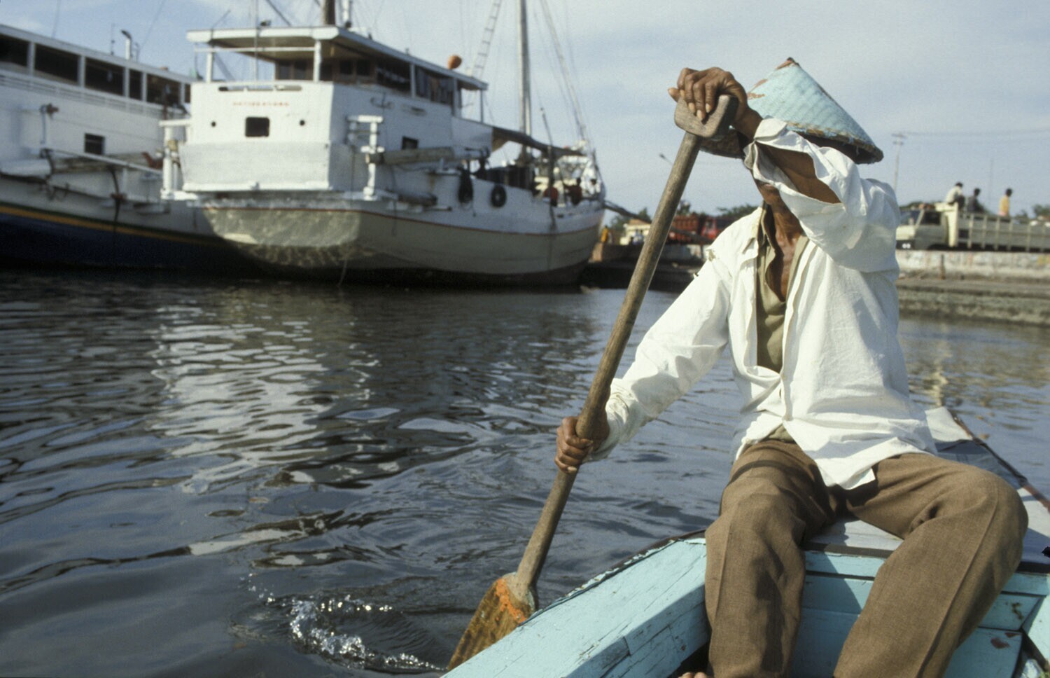 Roeiboot bij Buginese prauwen in de haven Sunda Kelapa