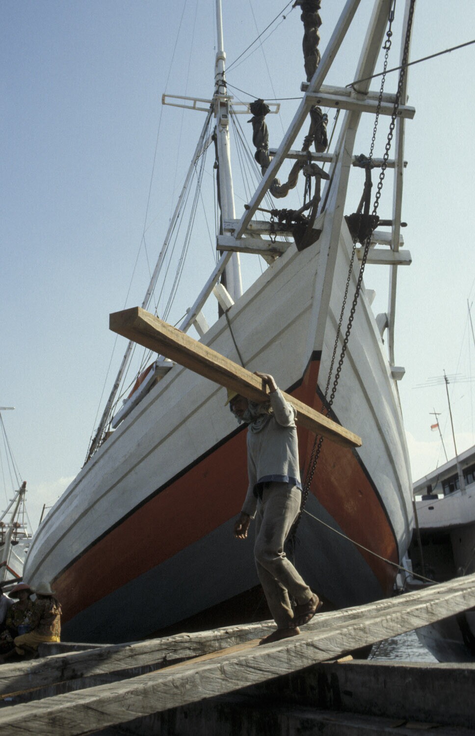 Het lossen van een lading hout aan boord van een Buginese prauw in de haven Sunda Kelapa