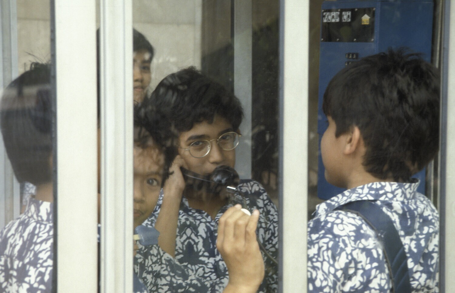 Schoolchildren in a telephone booth at the Istiqlal mosque