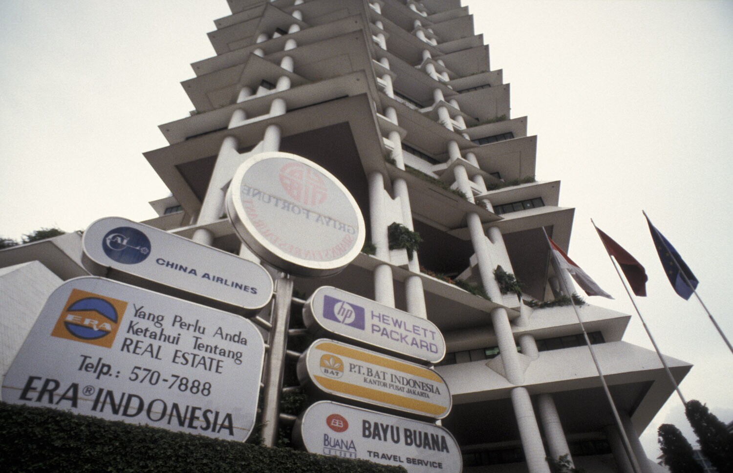 Java, Jakarta Kantoorgebouwen en reclame van bedrijven langs de jalan Surdiman