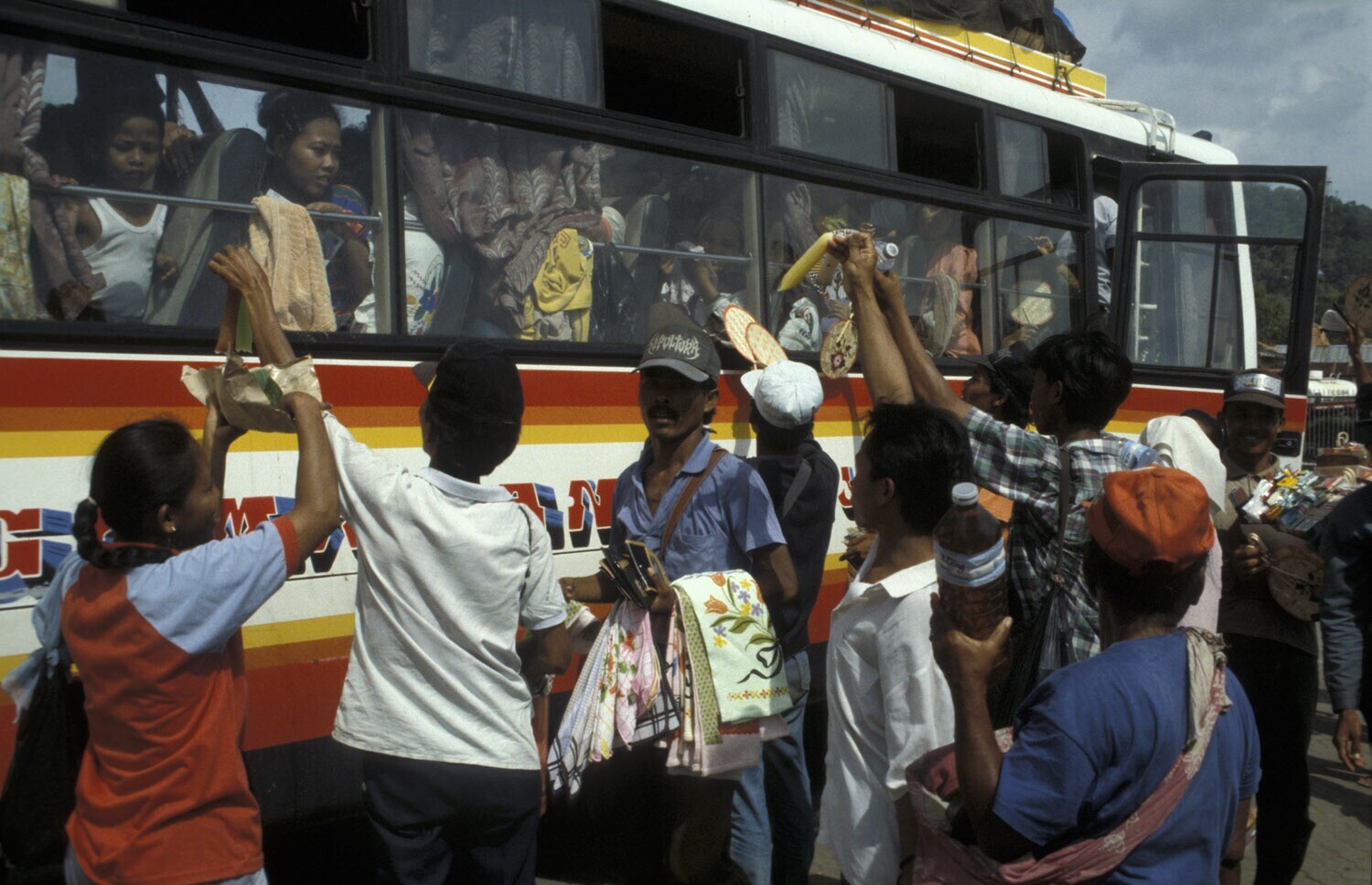 West Java, Merak Merak is het vertrek en aankomstpunt van de bootverbinding met Sumatra. Vanaf hier vertrekken ook de bussen richting oost Java. Verkopers bij stampvolle bussen