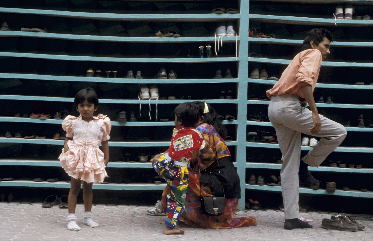 'Sumatra, Medan Hindutempel aan de jl. Arifin; kinderen bezig hun schoenen uit te trekken '