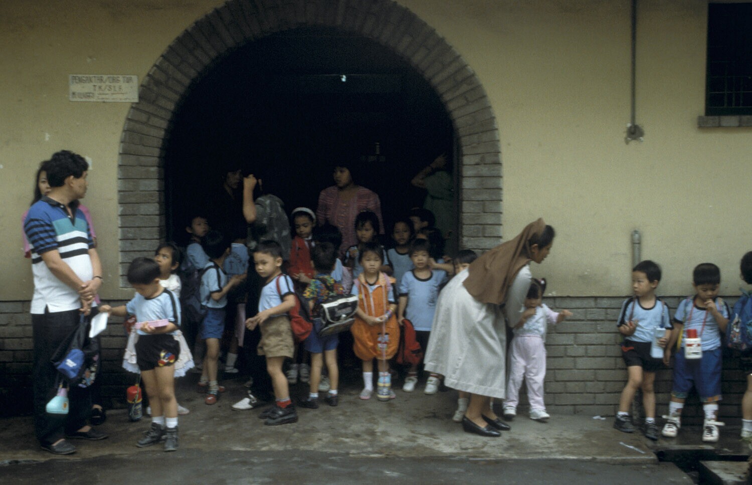 Sumatra, Medan Kinderen van de rk.-kleuterschool St. Yoseph. Vrnl. Chinese kinderen. Kinderen staan te wachten om afgehaald te worden.