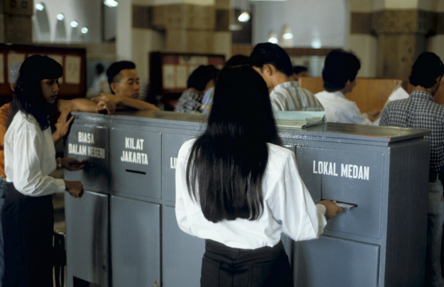 Sumatra, Medan Interieur van het postkantoor. Meisjes bij de brievenbus.