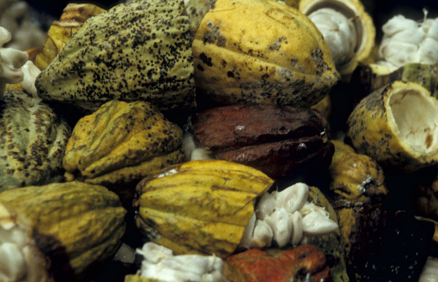 Geoogste cacaovruchten op plantage 'Mariendal' in de omgeving van Medan