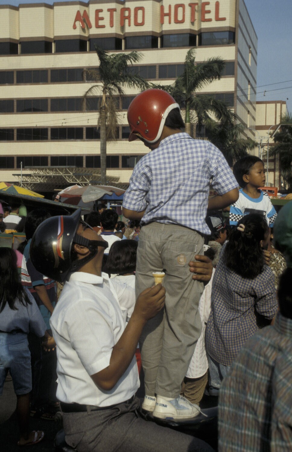 Java, Semarang Carnavaleske optocht aan de vooravond van Ramadan. Verschillende groepen presenteren zich hier. Het is een typisch Semarangs gebruik. De optocht trekt drommen mensen. Vader die zijn zoon opbeurt om de optocht beter te kunnen zien.