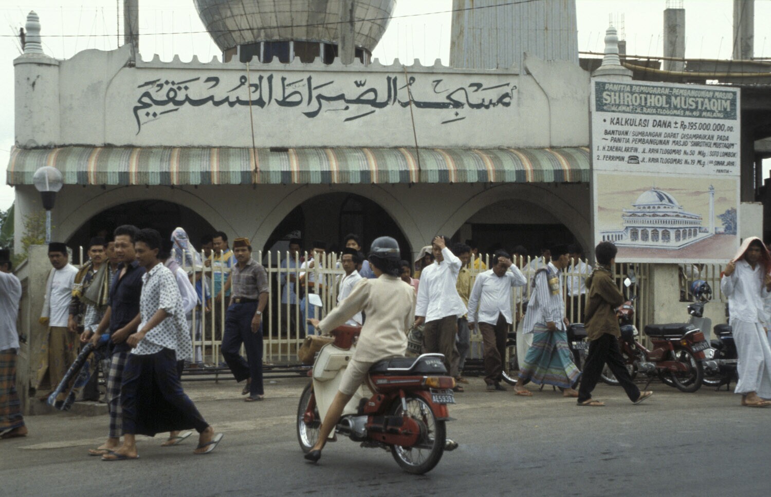 Java, omgeving Malang. Uitgaan van de moskee na het vrijdagmiddag gebed. Op de borden wordt de uitbreiding van de moskee aangegeven.
