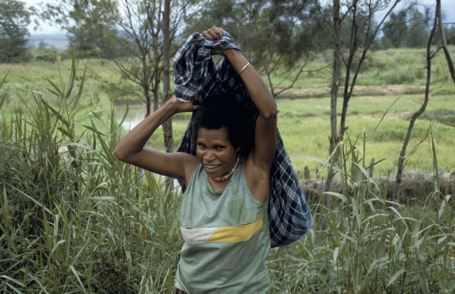 'Irian Jaya, Baliem Vallei Vrouw laat zien hoe een kind op de rug, in een net, wordt gedragen; kind wordt eerst in een doek gelegd; daarna worden de uiteinden van de doek op het voorhoofd vastgebonden '