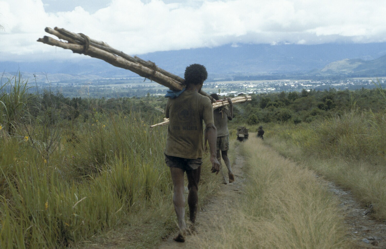Irian Jaya, Baliem Vallei Mannen met lange bamboestokken en hout op weg naar de markt in Wamena. Wamena is op de achtergrond zichtbaar