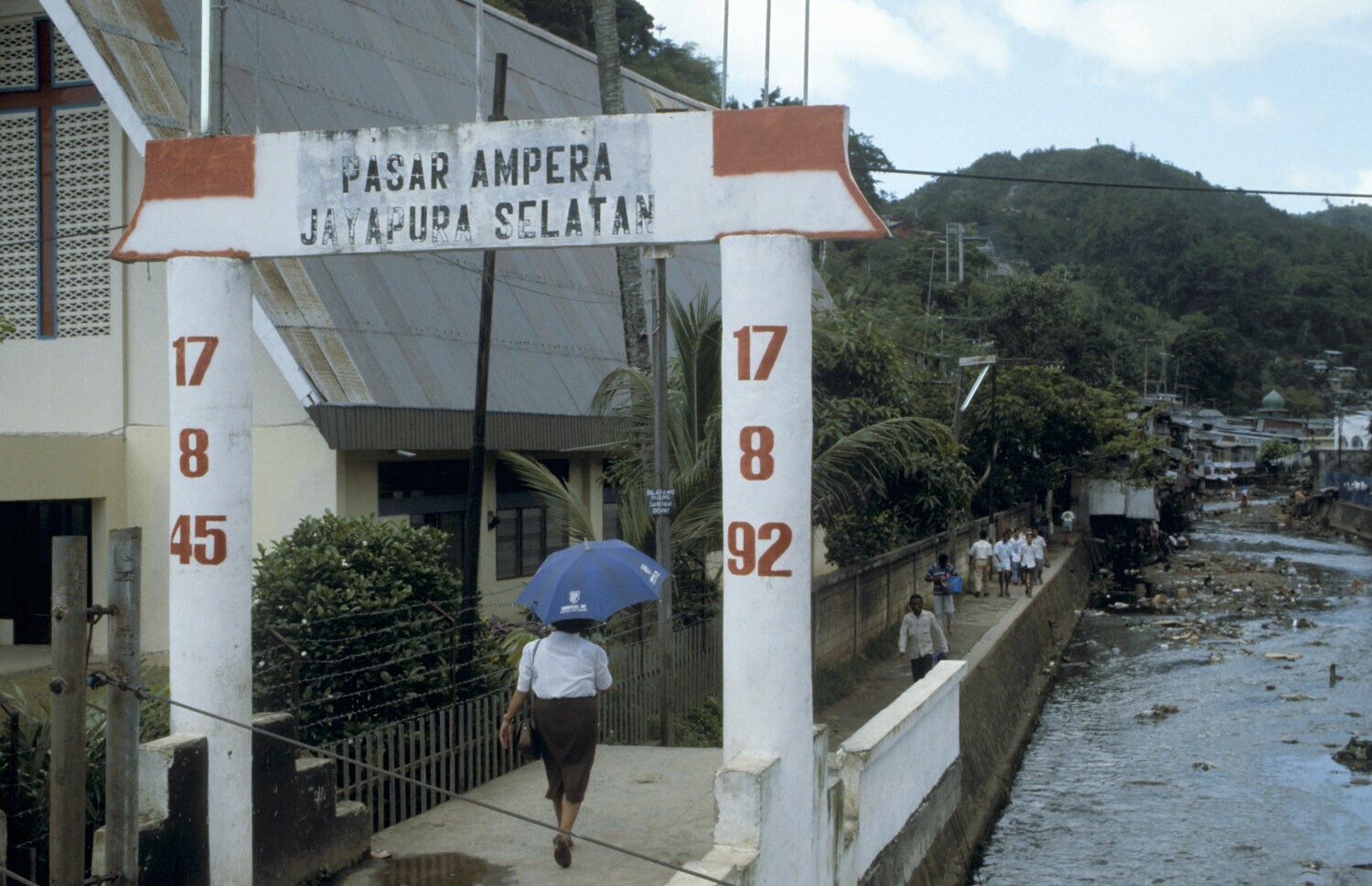 Irian Jaya, Jayapura Toegangspoort naar de Ampera-markt. Op de palen staat de datum van de onafhankelijkheid van Indonesië (17/8/45). NB. Irian Jaya werd pas in 1963 een deel van Indonesië.