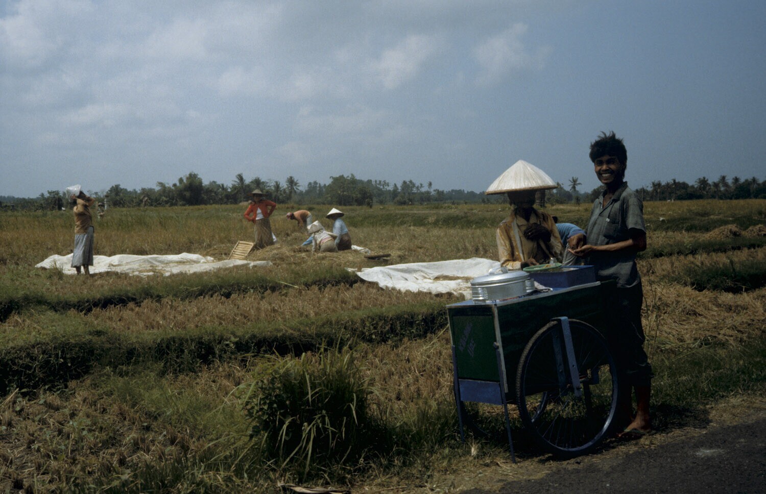 Tijdens het dorsen van de rijst, op de akker, komt er een man met een etenskarretje langs. Bali.