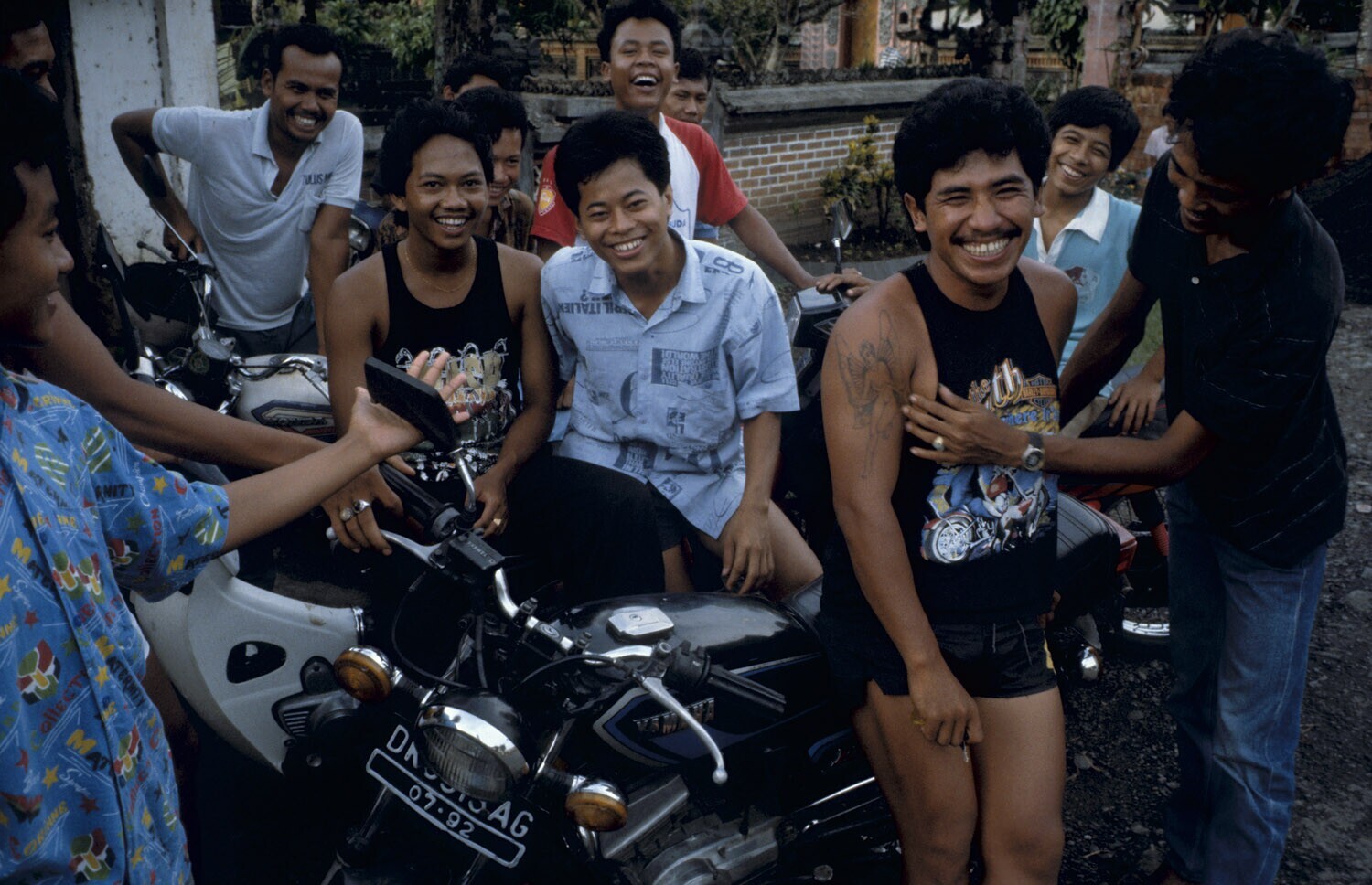 Groepje mannen bij en op motoren.