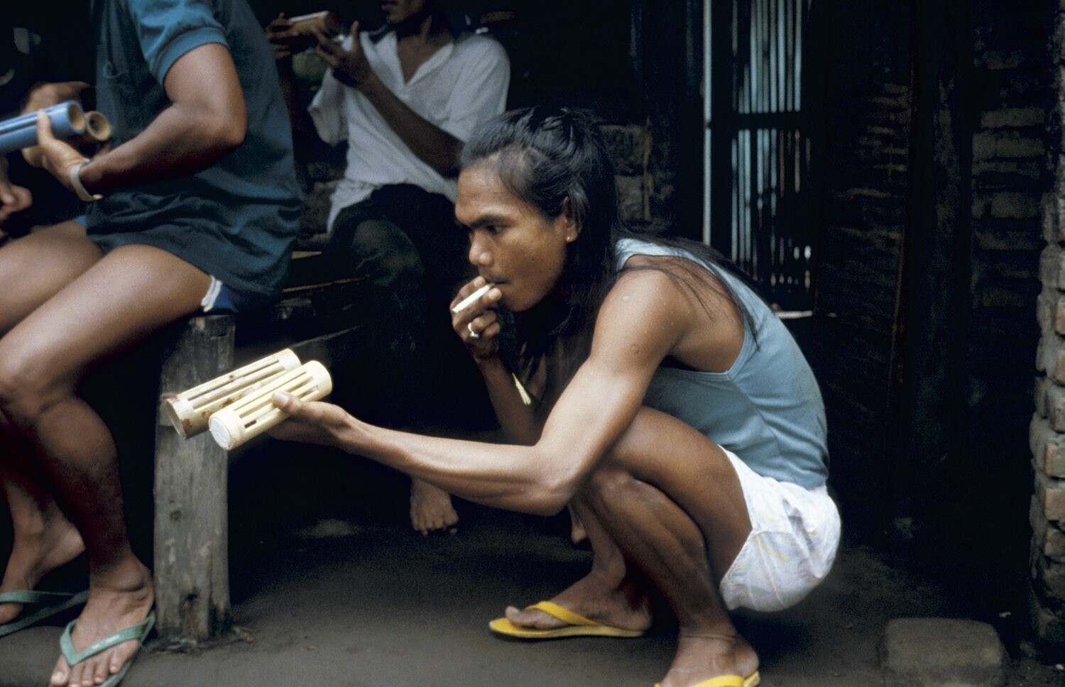 Man met twee kevertjes in hun kooitjes. Hier wordt mee gegokt.