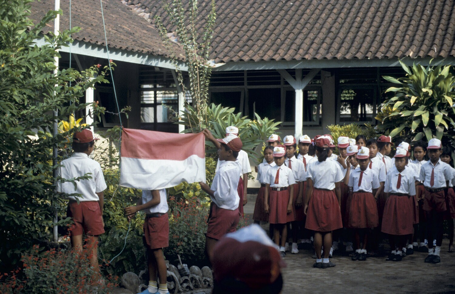 Kinderen van een padvindersclub heisen de vlag.