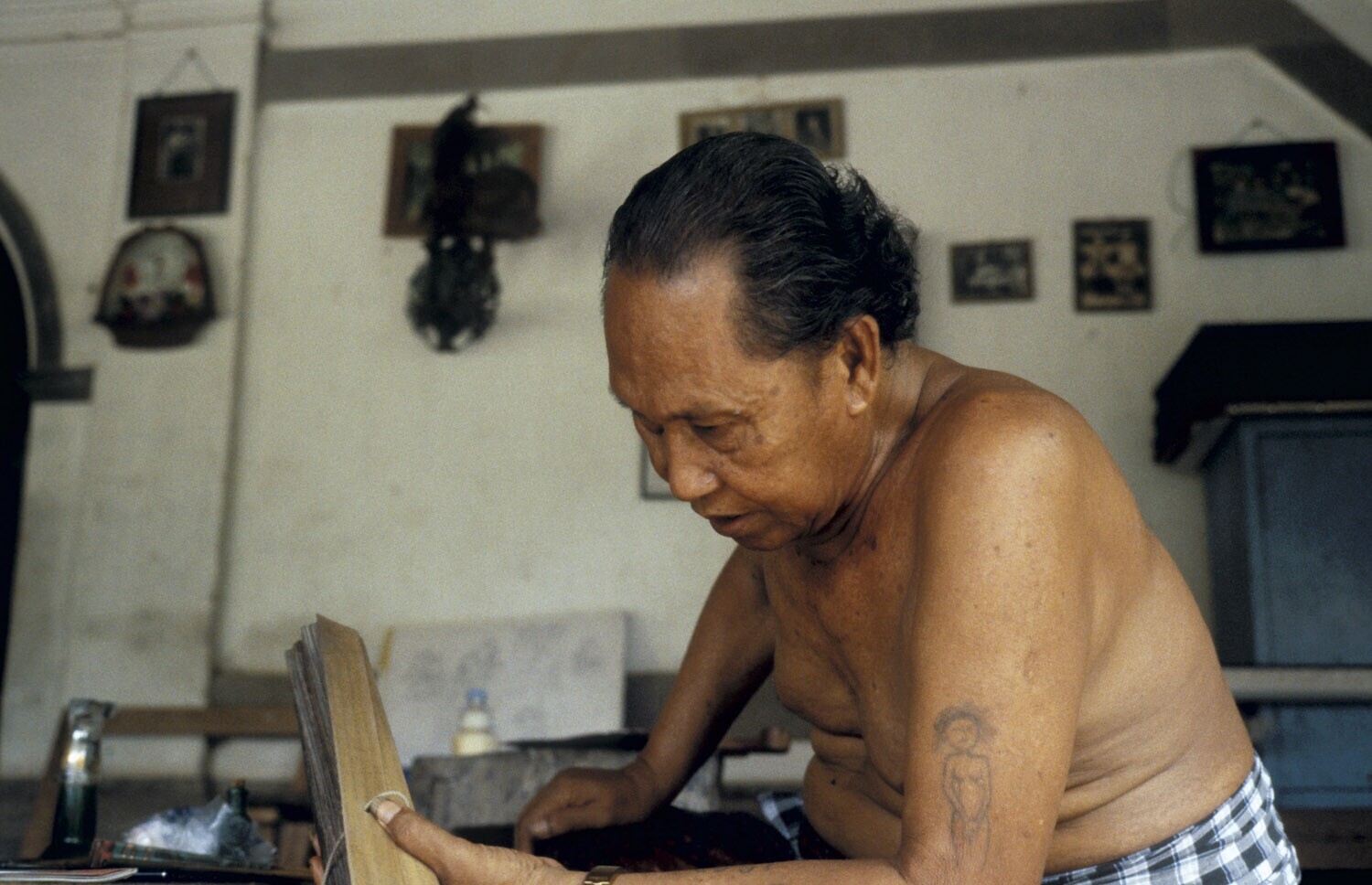 Man leest lontarboek. De lange smalle bladzijdes zijn gedroogde lontarbladeren, aaneen geregen met een touwtje.